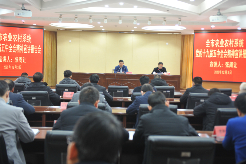 按照市委统一部署,12月3日,全市农业农村系统党的十九届五中全会精神宣讲报告会召开。市委宣讲团成员,市委农办主任,市农业农村局党组书记、局长张周让作宣讲报告。市农业农村局系统机关全体干部,各县区农业农村局主要负责同志,市农业农村局下属各单位班子成员及内设党支部书记、阿里地区在市农业农村局系统实践锻炼干部共150余人参加了会议。