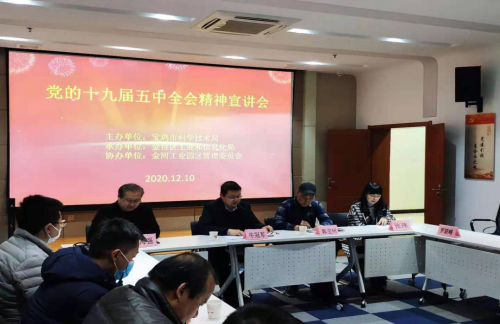 12月10日下午,在金台区科技工业园,宝鸡市“宣讲党的十九届五中全会精神科技工作者宣讲团”成员、市科技局党组成员、副局长牛冠军结合宝鸡科技工作和科技园区实际,对十九届五中全会精神进行了宣讲和解读。金台区工信局(科技局)、金台科技工业园管委会,园区内32家企业负责人和科研主管等共计40余人参会。