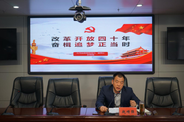 赵增强同志以“改革开放四十年,奋楫追梦正当时”为题,围绕改革开放的历史背景、重要意义、历史进程、伟大成就以及全面深化改革中司法行政人如何履职尽责五大方面的内容展开,介绍了改革开放前期的历史进程,阐释了改革开放精神的具体内容以及取得的建设成就,号召司法行政人立足本职、鼓足干劲、服务大局,为深化改革开放,推动实现高效能治理提供法治智慧、贡献法治力量。